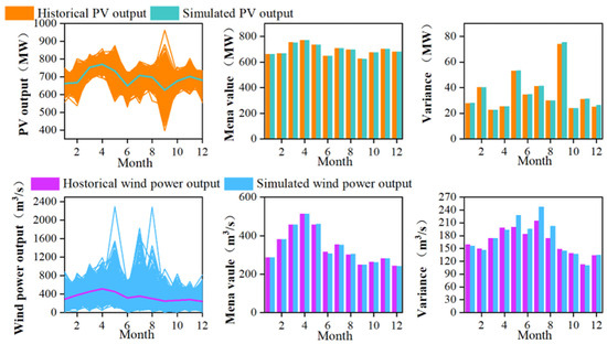 Based on the proposed multivariate stochastic simulation method, the time series of PV/wind power was simulated under specific uncertainties. The PV/wind simulated time series under a −10% scenario with a −10% change in inflow conditions are shown in Figure 4.