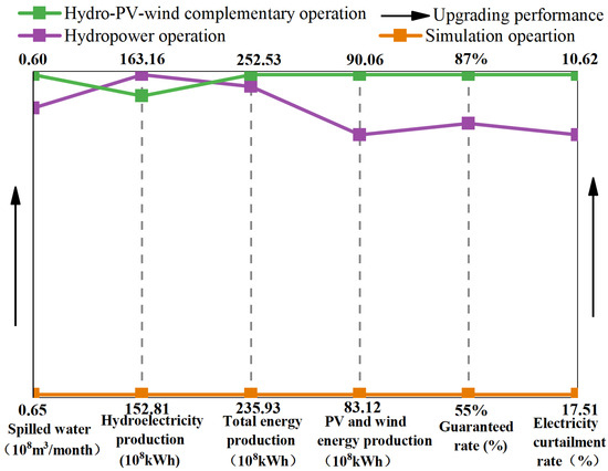 The other evaluation indicators under Scheme are better than those under Scheme I. This reveals that Scheme II optimizes the storage and release rules falling down rules of the cascade hydropower stations, thus increasing the water head and maximize hydropower generation. In contrast, Scheme I focuses on the complementary regulation for PV and wind power to minimize the electricity curtailment rate. Hence, the hydropower generation indicator in Scheme I is slightly lower than those under Scheme II.