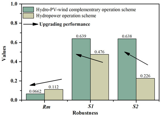 Figure 6 shows that all three robustness indicators indicate better robustness of the HGS under hydro–PV–wind complementary operation (Scheme I) compared to individual hydropower operation (Scheme II). Specifically, the regret-based indicator Rm and satisfied-based indicator S1 show relatively similar values under the two operation schemes, while the S2 indicator under Scheme I is significantly higher than that under Scheme II.