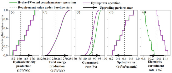 Figure 7a,d show that cumulative distribution of the hydropower generation indicator and the spilled water indicator are stair-shaped. This is because both indicators are primarily influenced by the uncertainty in inflow, and are less affected by variations in PV and wind power. Therefore, under uncertain scenarios where the inflow series remains constant, while PV and wind power output change, both indicators remain relatively stable. In addition, the cumulative distribution curves under Scheme II exhibit strict stair-shaped patterns, whereas the shapes under Scheme I are approximately stair-shaped. This is due to the operation decision of the HGS under the hydropower operating rule that was made based on the reservoir water level and inflow stage and completely independent of the PV and wind power state. However, the hydropower output of the HGS under the complementary operating rule needs to compensate for the PV and wind power output, subsequently sacrificing partial hydropower generation production. Similar findings in the existing literature [36] verify the effectiveness of the results in this study. Hence, the cumulative distribution curves under Scheme I in Figure 7a,d are approximately stair-shaped.