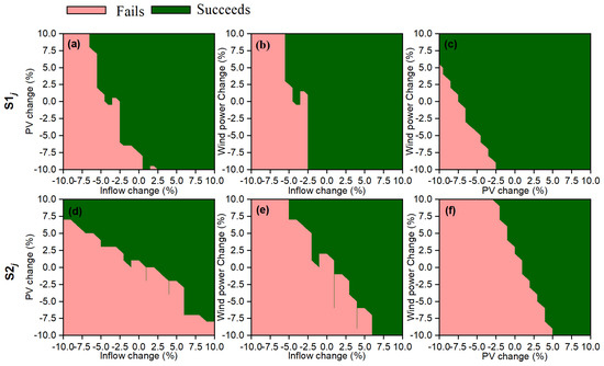 Figure 8a reveals that when the runoff variation exceeds 2%, S1i always equals 1, indicating that the robust requirement can always be met. Conversely, when the runoff variation is less than −7%, S1i is always equal to 0, indicating the requirement cannot be met. When under the range of [−7%, 2%], S1i may equal 0 or 1, depending on the changing scenario of PV power. Hence, the changing range of [−7%, 2%] can be used to quantify the sensitivity of the HGS’s robustness to the inflow uncertainty. In terms of the ordinate of Figure 8a, the changing range of PV power significantly exceeds the [−10%, 10%]. A smaller changing rage indicates stronger sensitivity. Therefore, HGS’s robustness is more sensitive to inflow based on the satisfied-based indicator S1.