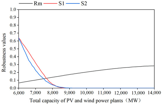 Figure 9 illustrates that, as the installed capacity of PV and wind power plants increase, the regret-based Rm continuously increases (smaller values indicate better robustness), while S1 and S2 decrease (larger values indicate greater robustness). These findings reveal that the HGS’s robustness weakens as the PV and wind power capacity increase.