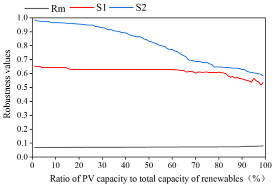 Figure 10 shows that, when the PV capacity ratio (counting the total capacity of PV and wind power) is less than 30%, all robustness indicators reveal that the HGS can maintain stable robustness. When the PV capacity ratio is greater than 30% but less than 85%, the satisfied-based S2 indicates a significant decrease in the performance and in the power supply reliability of the HGS. When the PV capacity ratio exceeds 85%, all indicators point to a decline in the comprehensive robustness performance of the HGS.