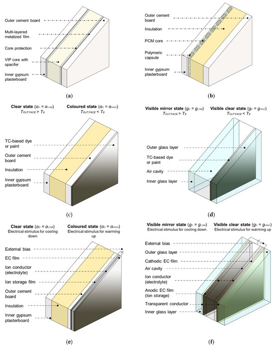 Thanks to its high insulation performance and its potential in keeping the envelope thin, the unique static intervention analyzed in this research is the implementation of vacuum insulation panels (VIPs). While among the most promising and emerging dynamic building envelopes, the authors decided to focus on phase change materials (PCMs) for their intrinsic ability to increase thermal heat storage and switchable coatings, subdivided into thermochromic coatings (TCCs) and electrochromic coatings (ECCs). These last two interventions, based on switching the solar absorptance of opaque surfaces according to external stimuli, are analyzed for transparent surfaces too but by switching the solar reflectance of glass. These are called thermochromic windows (TCWs) and electrochromic windows (ECWs).