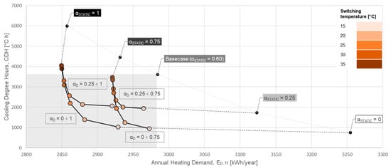 Moving on to adaptive envelope solutions, both the switchable coatings and glazing were benchmarked against their corresponding static solutions to assess their energy-saving and comfort-enhancing potential. The application of static solar absorptance for coatings (e.g., wall paint) or static solar reflectance for glazing were taken into account because they represent a much lower price intervention than dynamic solutions. On the other hand, the static nature of these measures has no control over solar heat gains. Considering coatings as an example, a high solar absorptance (αSTATIC = 1) coating captures more solar energy, which in turn increases the heat flow through conduction and proportionally decreases the amount of heating required in winters but increases the cooling requirement in summers. A low solar absorptance (αSTATIC = 0) coating reflects all incoming solar irradiance and thus has lower thermal conduction in the building, which therefore reduces the CDH value during summers but increases the heating demand during winters. The increase in heating demand caused by low solar absorptance coatings is commonly referred to as heating penalties [25]. In the scatter plot of Figure 4, these static measures are grouped in a light gray curve with the base case reference, whose solar absorptance was assumed to be 0.60.