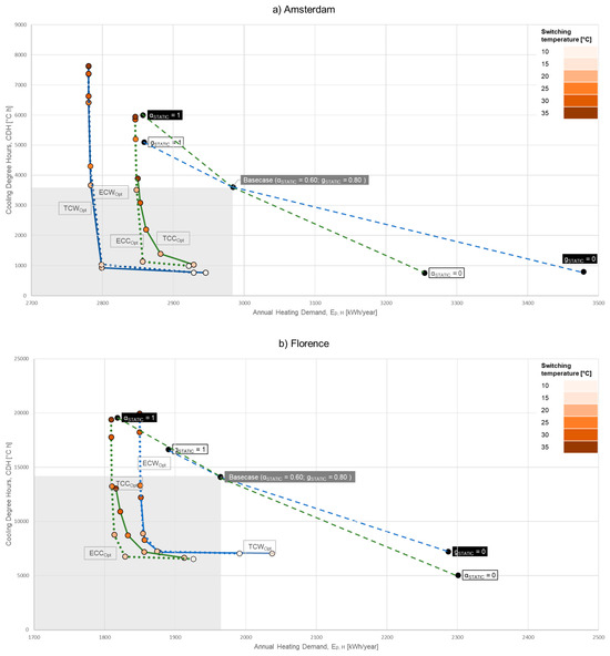 When analyzing the cooling season, the research was divided into two different HVAC concepts. In the case where the system was in free-running mode during summer, PCMs were a good overheating protection measure, as they enhanced the indoor thermal comfort by reducing the indoor operative temperature. The optimized melting point solution for the Amsterdam case led to a 77.6% CDH reduction compared with the base case. Meanwhile, in Florence, the CDH could be reduced by up to 56.8% because of the warmer climate (Figure 3). Even the ECC solution had a similar CDH reduction in the Italian case (Figure 5b), but if also considering Ep,H,, the optimized PCM case dominated the ECC in the Pareto front. Aside from their energy performance in summer, PCMs turned out to be a good trade-off because they have good transport flexibility too, as mentioned in Section 2.5.