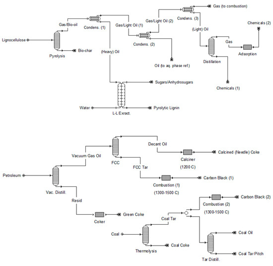 Simplified process flow diagrams for (top) biomass (lignocellulose) pyrolysis refinery showing pathways to sugars/anhydrosugars and pyrolytic lignin from liquid-liquid extraction, liquid for aqueous phase reforming, gas for combustion, and other commodity/fine chemicals; and (bottom) petroleum and coal refinery showing pathways to heavy oils/tars and industrial carbon products (not showing light hydrocarbon fractions). Adapted from previously published work by (top) Fonts et al. (2021) and (bottom) Elkasabi and Mullen (2021) [3,18].
