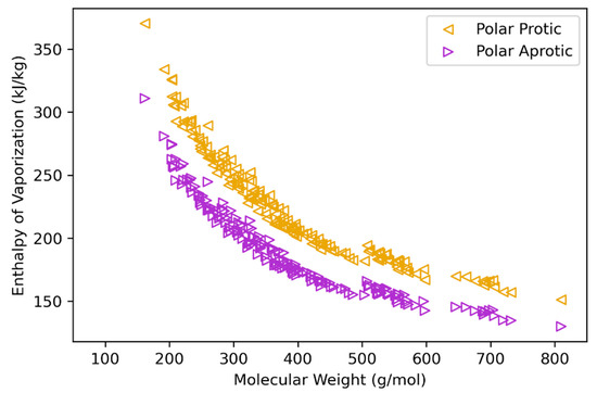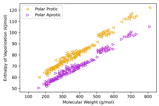 The heat of vaporization (HVAP, kJ/mol) for each studied structure was estimated using correlations recently proposed by Krimizis-Tsastsoulis [59]. These correlations are derived from Trouton’s Rule, a classical thermodynamics observation that suggests that the entropy of vaporization (SVAP, J/mol-K) for any (non-polar) compound is approximately equal to 88 J/mol-K [59,60]. Krimizis-Tsatsoulis provides three correlations (that are used herein) for SVAP in terms of TB for non-polar, protic polar, and aprotic polar compounds, which are given in Equations (7)–(9). The value for HVAP is estimated from the product of TB and SVAP, as in equation 10. A factor of 1000 is included to account for SVAP units of J/mol-K and HVAP units of kJ/mol, with TB units of K.