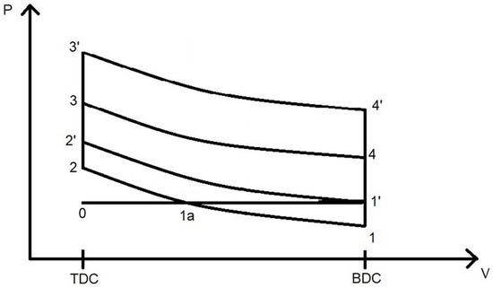 The cycle 0––––––0 shows the P-V relationship of a standard Otto cycle, and the cycle 0–1a–1–2–3–4–1–1a–0 shows the P-V relationship of an EIVC Miller cycle. The intake valve opens at point 0 and closes at point 1a. In EIVC Miller cycles, the intake valve remains open for a shorter period of time. Stage 1–1a in Figure 1 shows the blow-back effect produced by the EIVC. After the intake valve closes at 1a, the downward movement of the piston decreases the cylinder pressure from ambient at stage 1a until stage 1, when the piston reaches the bottom of the combustion chamber. The sub-ambient pressure inside the combustion chamber between stage 1a and 1 produces the so-called ‘blow-back’ effect, which consumes only a negligible amount of energy to bring the piston from the bottom position back to the position when the intake valve was closed; then, the compression stroke starts. The EIVC shortens the compression stroke while keeping the expansion stroke, thus increasing the overall engine efficiency.