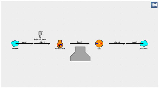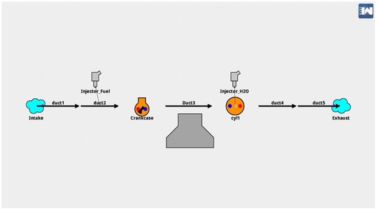 The baseline model was developed based on the experimental data provided in the study by Knaus et al. [22] for a 31 cc version of the Stihl 4-MIX engine design, as shown in Figure 2. After validating the baseline model, additional upgrades were implemented to improve its emission characteristics while maintaining performance integrity. The refined model’s structure is depicted in Figure 3, with modifications primarily concentrating on parameters. The only structural discrepancy between the two models is the inclusion of a water mass flow injector, labeled Injector_H2O.