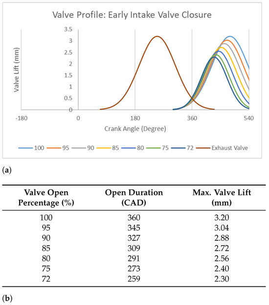 There are two different approaches to implementing EIVC with the same principle: variable valve timing (VVT) and variable valve lift (VVL) [20,21]. VVT adjusts the duration of valve opening, while VVL modifies the valve lift values to reduce the rate of gas intake and enhance the blow-back effect. In this study, both techniques were applied and expected to significantly enhance the effects of EIVC. The specific procedures are outlined in Section 2.5.