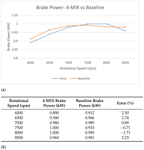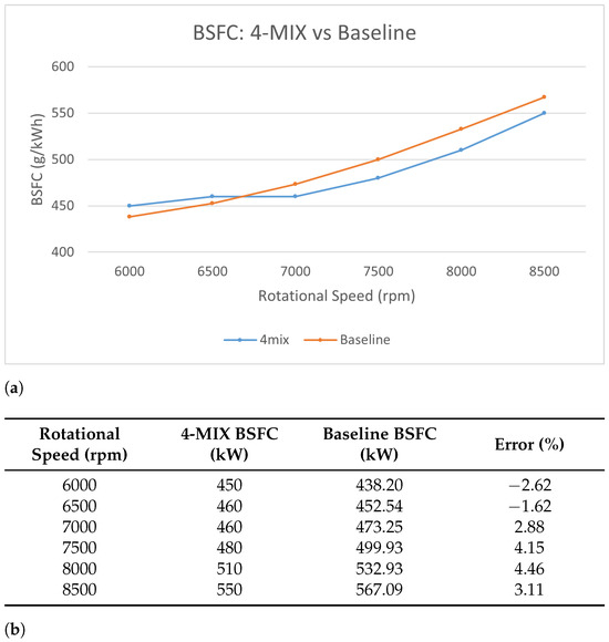 Figure 7 shows comparisons of brake specific fuel consumption (BSFC) between the 4-MIX engine and the baseline model with the increment of rotational speed. Specific results are tabulated in Figure 7b.