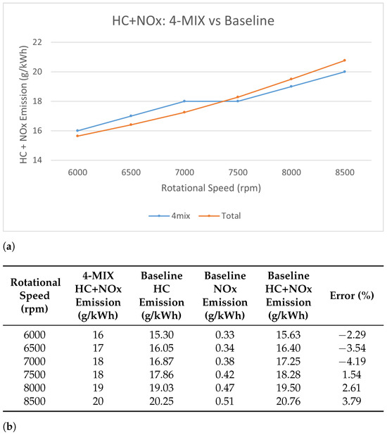 Figure 8 shows comparisons of combined unburned hydrocarbon and nitrogen oxides emission (HC + NOx) between the 4-MIX engine and the baseline model. Specific results are listed in Figure 8b.