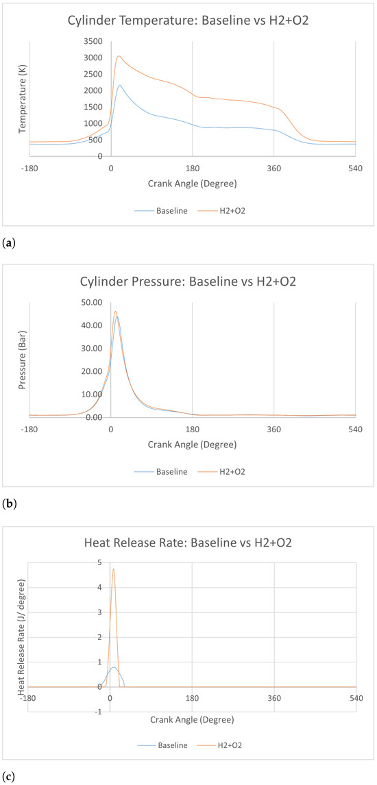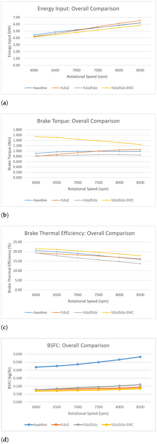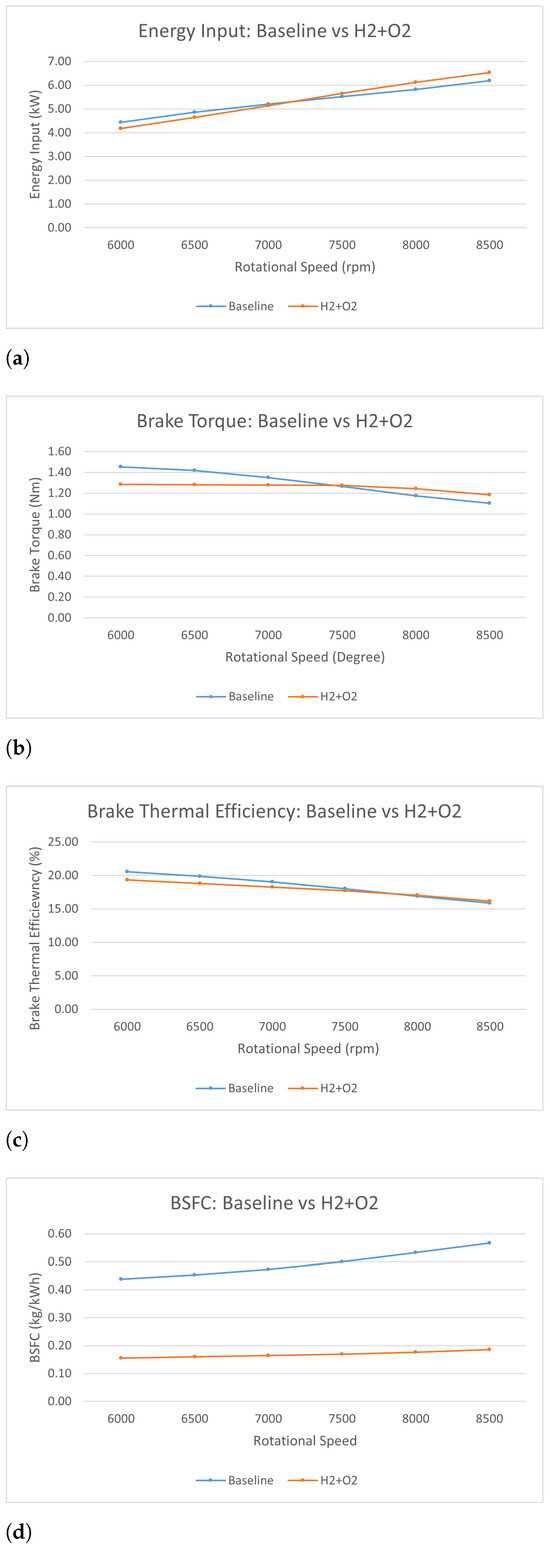 Figure 9a shows the energy input rate results of the baseline and oxyhydorgen models. Both of these lines are nearly straight, which show that the growth of energy input rate is proportional to the growth of rotational speed. Each 500 rpm increment of rotational speed can boost the increment of energy input for 0.5 kW. The energy input rate of these two models was controlled on a similar level (5.51 kW).