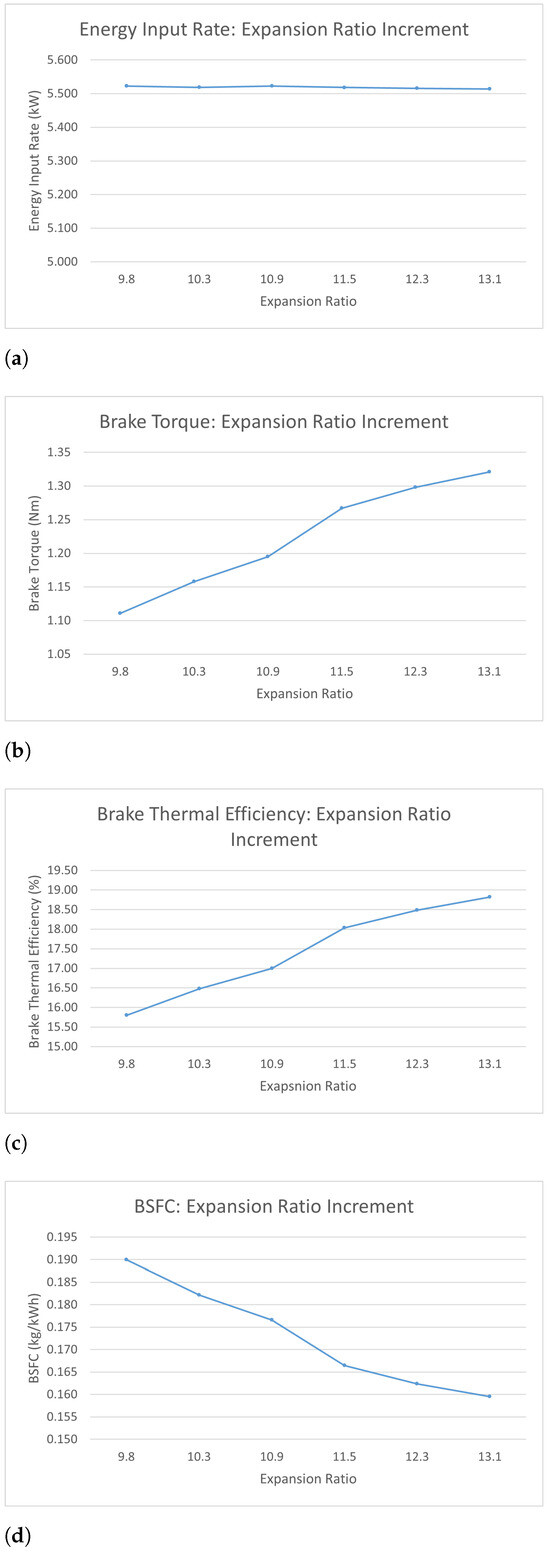 Typically, Miller cycle ICEs are equipped with a supercharger or turbocharger to offset the effect of induced air loss caused by EIVC. However, since this study utilizes the lean burn technique and proportional injectors, the induction loss from EIVC can be ignored. Therefore, neither a supercharger nor a turbocharger was included in the model’s structure.