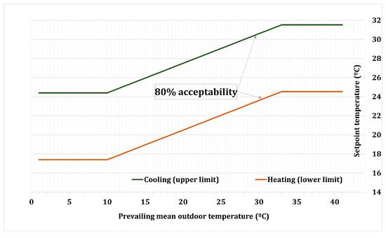 Upper and lower limits considered in the adaptive comfort model with the 80% acceptability.