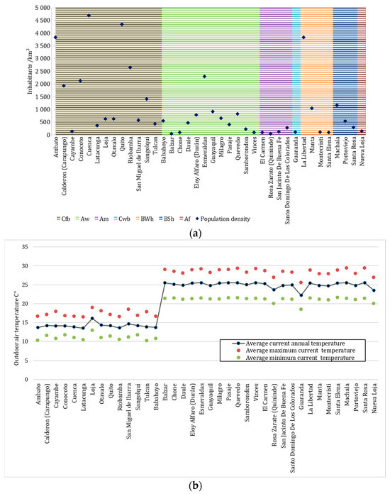 Ecuador only emitted 0.16% of the global greenhouse gas (GHG) emissions in 2018 [20]. In this country, GHG emissions from the production sector of raw materials and materials was 3.2% in 2018, whereas energy was responsible for 51% of emissions in the same year, with the building sector being within this category with a total of 2529.58 Gg CO2-eq in comparison with the 75,326.87 Gg CO2-eq generated by all categories in that year [21]. Consequently, the Ecuadorian territory is also affected by global warming, following the global trend of rising temperatures, demands and, therefore, greenhouse gas emissions [22]. Given its climate diversity, it is interesting to study how it affects parishes so as to obtain more detailed results of the consequences. According to several studies, climate change has led to floor erosion, with sub-Saharan Africa, South America, and Southeast Asia being the most affected areas between 2001 and 2012 [23]. Ecuador has acquired a commitment as part of both the United Nations Framework Convention on Climate Change (UNFCCC) and the Paris Agreement, as well as the recognition of a shared responsibility to protect the climate as a common good of humankind. In addition, since 2016, the National Energy Agenda was published, which seeks to decarbonize the country’s electricity sector with the use of hydroelectric plants [24].