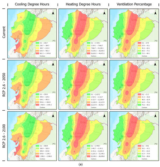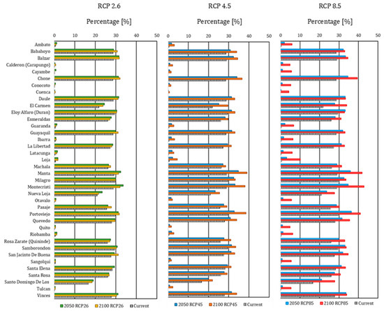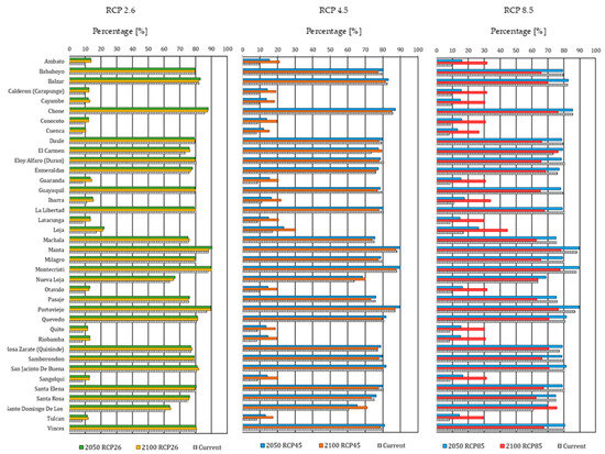 As for future scenarios, climate change would affect some locations and benefit others. Generally, values were similar for 2050 regarding the percentage of parishes where the model could be applied more than 75%, whereas the locations where the model could be applied more than 80% went from 12 to 9. There was also a significant change with the increase in the percentage of application of natural ventilation in Cfb zones, such as the Metropolitan District of Quito, which obtained 12.14%, 13.89%, and 15.59% in RCP 2.6, RCP 4.5, and RCP 8.5, respectively. However, in the conurbation of Guayaquil—Samborondón—Durán, it was reduced on average by one percentage point in the future scenarios in contrast to the current scenario results (Figure 4).