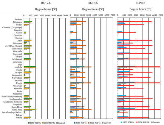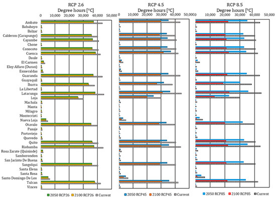 The same tendency took place for 2050, where 27% of the locations did not require cooling degree hours, i.e., the same amount than in the current climate scenario. In RCP 2.6, a total of 16 locations required less than 200 degree hours, in comparison with the 17 locations in RCP 4.5 and RCP 8.5, where the number of parishes requiring more than 800 units increased to 18. The number of locations that required more than 2000 cooling degree hours increased to four: Santa Rosa, Machala, Pasaje, and Milagro, with 2823.1, 2778.8, 2745.3, and 2045.3, respectively. Equally, the Metropolitan District of Quito did not present any demand, and the conurbation of Guayaquil—Samborondón—Eloy Alfaro (Durán) averaged 1611.8 units.