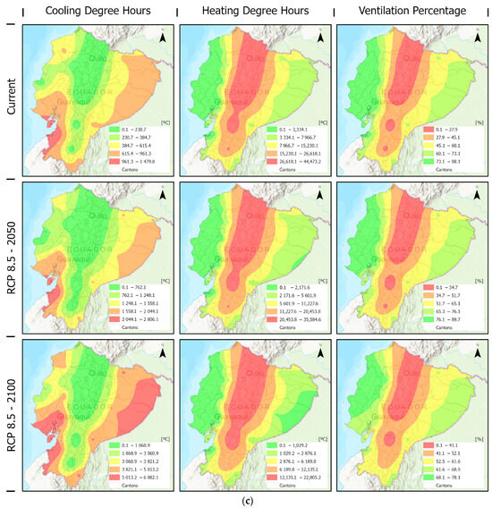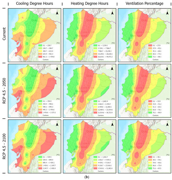 Figure 8 includes the result of the current climate scenario: the areas with greater cooling demand did not obtain significant heating demand, but high percentages of natural ventilation, such as Machala, Pasaje, and Santa Rosa, which are very close to each other. Manta, Montecristi, and Portoviejo were also stressed because these parishes presented the most favourable conditions: their percentages of application of natural ventilation were greater than 80%, and they presented the lowest cooling and heating demands.