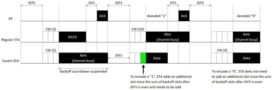 Covert STA sending “0” and “1”, encoded using the contention window (based on [4], Figure 1).