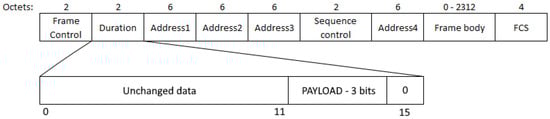Our new proposed mechanism for encoding the next three bits of the message uses the three least significant bits of the duration/ID field (not counting bit 15 as it is always 0 if the field describes duration) in the MAC header of the frame, as shown in Figure 2. They are read as-is by the receiver. This allows for increasing the efficiency of the entire mechanism by another 300%. However, it must be admitted that this mechanism has the side effect of causing a slight timing deviation in the network. The choice of the three least significant bits in the ‘Duration’ field is deliberate as the maximum timing deviation it may cause is 7 , which is less than the shortest xIFS time (SIFS) for the analyzed IEEE 802.11ax network (see Table 2). Using 4 bits would cause it to cause deviations of up to 15 , so to reduce the risks of making the network unstable it was forgone. In Section 5.2, we present a study on the impact of the number of duration/ID field bits on the covert channel performance.