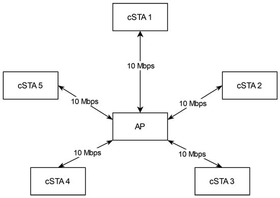 The covert channel was implemented using the ns-3 discrete-event network simulator (version 3.40) [47]. This open-source simulator—constructed using C++ and Python 3—offers a plethora of functionalities, notably encompassing robust support for simulating IEEE 802.11 networks. NS-3 emerged as the prime selection owing to its seamless alignment with the latest IEEE 802.11ax standard, its dynamic and helpful community, and its continual growth over time. Within simulations, NS-3 provides adaptability, effectively simplifying the intricacies of IEEE 802.11 networks within a simulated domain. Table 3 shows the general network parameters used for all simulations, unless specified otherwise in the description of a specific simulation. All figures in simulations had errors and run-to-run variances under 1% and, thus, were omitted from graphs for better readability.