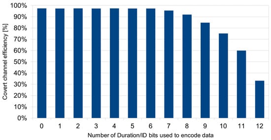 Figure 4 shows that the efficiency of the covert channel decreases with the growth of the number of duration/ID bits used in transmission. This is due to the increasing error in the reported transmission duration, which leads to further collisions, especially between stations that are not the recipient of a given transmission and make subsequent transmission decisions based on the NAV vector. Using more than seven bits leads to efficiency degradation. At that point, the deviation from the correct transmission duration value reaches 128 or slightly more than DIFS and 10 time slots. From the 9th bit onward, the efficiency rapidly declines, reaching 60% at 11 bits and going below 40% at 12 bits.