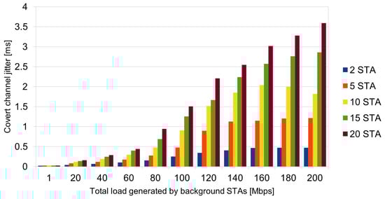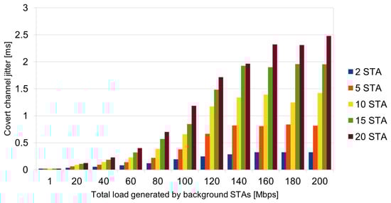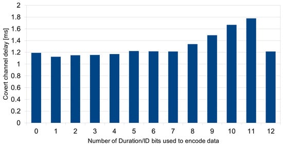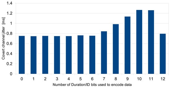 Figure 6 and Figure 7 show that changes in the duration/ID field slightly impact delays and jitters experienced by the network in which the covert channel is active, but these effects remain within acceptable limits regardless of the parameters. The delay peaks at about 1.8 ms, which is just a 0.6 ms increase over the baseline observed when the covert channel is disabled. Meanwhile, the jitter reaches just above 1.2 ms at its peak, which is only slightly less than 0.5 ms higher than under normal conditions for the tested network.