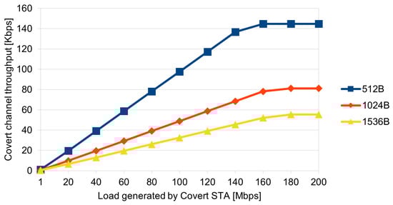 Figure 9 shows the impact of the generated load on the throughput of the covert channel. The findings indicate that the channel throughput increases linearly up to a certain point and then remains constant. The frame size significantly impacts the overall channel throughput; smaller frames occupy the channel for shorter durations, thus allowing more frames to be sent within the same timeframe, which directly increases the throughput. Another thing worth noting is that the plateau point can be directly correlated with the point of network saturation and scales slightly with the size of the frames sent. The smaller frames lead to more network overhead, which leads to faster network saturation. The obtained results confirm that the efficiency of the proposed covert channel is four times higher than the covert channel described in [4].