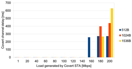 Figure 10 shows that the impact of the covert channel on network delay is negligible until the network saturation point. The figure also very clearly shows the approximate saturation point for each frame size as we can clearly notice a sharp increase in network delays for each frame size (160 Mbps for 512 B and 180 Mbps for 1024 B and 1536 B, just becoming worse at 200 Mbps). Below the 160 Mbps mark, the delays are entirely within acceptable limits for an IEEE 802.11ax standard network.