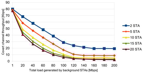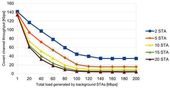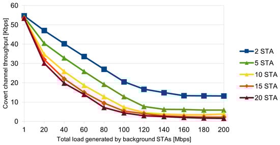 Covert channel throughput vs. number of background STAs and background network load for 512 B frames.