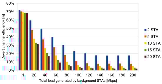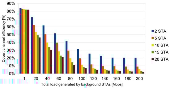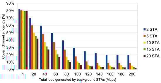 Covert channel efficiency vs. number of background STAs and background network load for 512 B frames.
