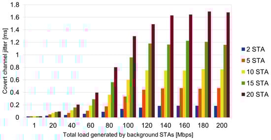 The third and final experiment for the basic algorithm involves a single covert STA communicating with a single AP with a set number of background stations generating background traffic (Figure 11). All STAs generate UDP traffic at a constant frame size. The covert STA uses the same frame size as background STAs and uses three duration/ID fields to carry the data on top of the backoff mechanism. Additionally, the covert STA constantly sends data at 200 Mbps. The experiment is repeated for different numbers of background STAs and different frame sizes.