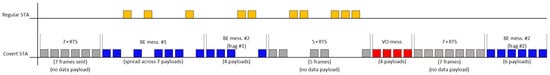 - Holloway, R.; Beyah, R. Covert DCF: A DCF-based covert timing channel in 802.11 networks. In Proceedings of the 2011 IEEE Eighth International Conference on Mobile Ad-Hoc and Sensor Systems, Valencia, Spain, 17–22 October 2011; pp. 570–579. [Google Scholar] [CrossRef]
