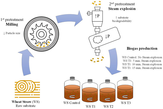Thermal pretreatment is an effective strategy to improve the degradability of lignocellulosic wastes [9]. It consists of subjecting the waste to high temperatures, typically above 150 °C, for a given time [10]. This process breaks down the lignocellulose structure, increasing the accessibility of enzymes and facilitating the release of monomers. Thermal pretreatment can be performed by different methods, such as steam explosion, pyrolysis, and or in combination with chemical processes such as a thermal–acid treatment [11], which is the most widely employed pretreatment method for lignocellulosic biomass due to its cost-effectiveness and efficiency [12]. These methods modify the chemical composition and physical properties of the residues, making them more susceptible to enzyme action during the fermentation stage [13]. As a result, a higher conversion of waste to biogas is achieved, thus improving the efficiency and profitability of the process of producing renewable energy from lignocellulosic waste [14]. Steam explosion has been tested in the case of cereal straw and obtained a wide range of values in terms of an increase in biogas production. This process involves exposing the material to high temperatures by directly injecting saturated steam; subsequently, the material undergoes rapid depressurization, which generates shear forces capable of separating the fibers.