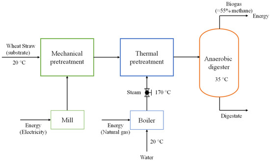 A scenario was created based on the configuration shown in Figure 2, which integrates two pretreatment methods: mechanical and thermal. The energy requirements for both pretreatment processes were determined using the electrical consumption for substrate grinding and the steam requirements based on Cano et al.’s (2014) prior research [19]. To achieve this, the scenario was applied in a full-scale plant, with a thorough analysis of energy inputs and outputs.