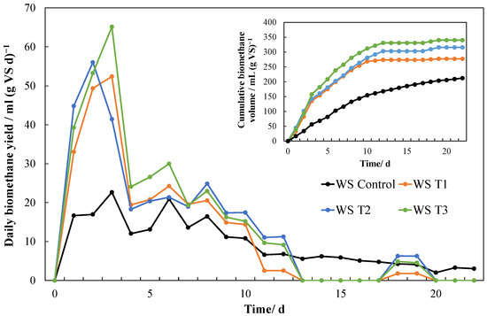 Daily and cumulative biomethane production from the anaerobic digestion of wheat straw with steam explosion pretreatment at different conditions throughout the experiment. WS Control stands for wheat straw standalone, and WS T1, WS T2, and WS T3 for wheat straw with a 5 min, 10 min and 15 min period of steam explosion pretreatment, respectively.