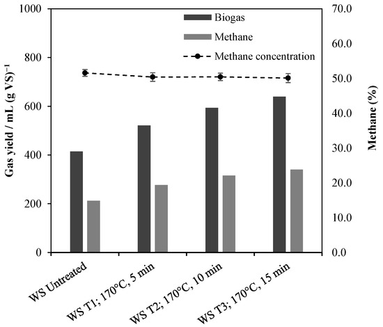 Substrates with high vs. content like wheat straw, ideally above 110 g kg−1, have demonstrated positive outcomes when applying a steam water pretreatment [19]. Conversely, it is important to highlight that other waste materials, such as fatty wastes, may require no pretreatment and can yield exceptionally high energy consumption levels exceeding 3000 kWh∙t−1. This underscores the substantial potential for anaerobic digestion in this substrate category [19]. On the other hand, waste materials with greater availability but lower volatile solid content, such as livestock waste or sewage sludge, do necessitate pretreatment to achieve positive net energy balances in the process [52,53].