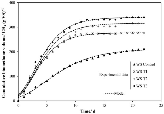 The modelling with the Gompertz equation is illustrated in Figure 5 and the corresponding parameter values are detailed in Table 4. Higher rates of biogas production, denoted as R in the model, signify a mitigation of the rate-limiting step within the hydrolysis phase, with maximum values in the more intense pretreatment. Specifically, WS T1 achieved a value of 38.89 mL biomethane g VS−1∙d−1, while WS T2 achieved 40.19 and WS T3 reached 43.68. Likewise, the reduction in the lag phase was evident, as indicated by values approaching zero in all trials, as a consequence of the reduction in fiber size and the subsequent increase in the hydrolysis step.