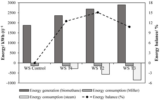 where E(generation) is the energy produced in the anaerobic digestion process and E(consumption) is the energy consumed including the pretreatments.