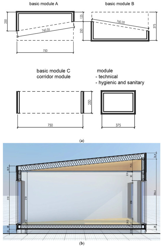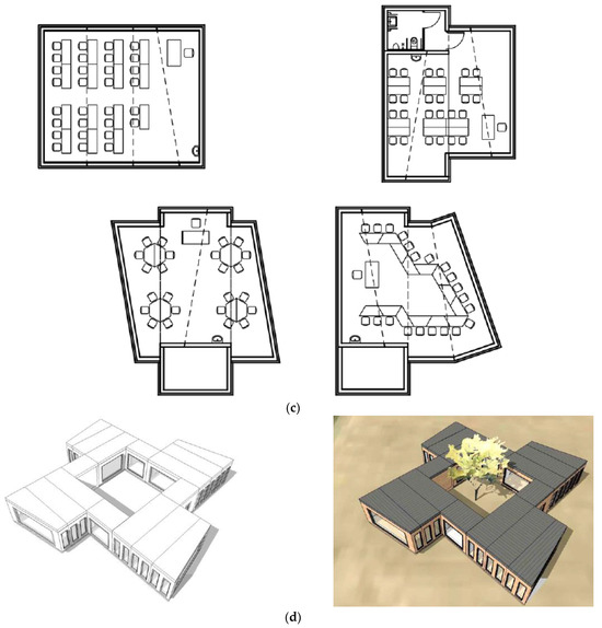 (a) Top view of the basic modules. (b) Side sections of basic modules A, B. (c) Examples of room arrangements for classrooms. (d) Visualization of a sample set-up of three modular rooms including sanitary facilities and technical rooms.
