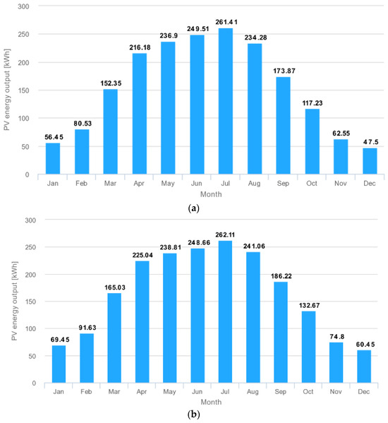 The authors consciously used the PVGIS database [27], which approximates the data to some extent and averages the efficiency. In addition to the position and orientation of the panels, the overall PV energy production will be influenced by factors such as cooling, depending on the arrangement method. The most advantageous variant of arrangement on walls or roof was assumed here, and the energy production was estimated by the PVGIS application using satellite data regarding solar radiation. It is obvious that the efficiency of PV modules depends on both temperature and solar radiation intensity. It is possible [28,29] to precisely determine the losses and efficiency of PV systems, taking into account the characteristics of modules, converter systems, and the MPPT algorithms used; however, for design purposes, the PVGIS database [27] allows for an effective estimation of energy production efficiency. The PVGIS database assumes an estimated power loss of 8% due to temperature effects (a general value that has been found to be reasonable for a temperate climate). In addition, it is necessary to estimate system losses that cause the power actually delivered to the power grid to be lower than the power produced by PV modules. There are several reasons for these losses, such as losses in cables, inverters, or additional losses in PV modules resulting from, for example, dirt. Modules also lose some of their power over the years, so the average annual power output over the life of the system will be several percent lower than the power output in the early years. For general estimates, we adopted the loss value of 14% proposed by the PVGIS database for the average monthly energy production by the PV system.