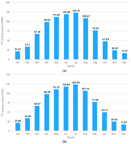 (a) Monthly production for a 20° slope and west-facing fall azimuth. (b) Monthly production for a slope of 20° and an azimuth of fall to the east.