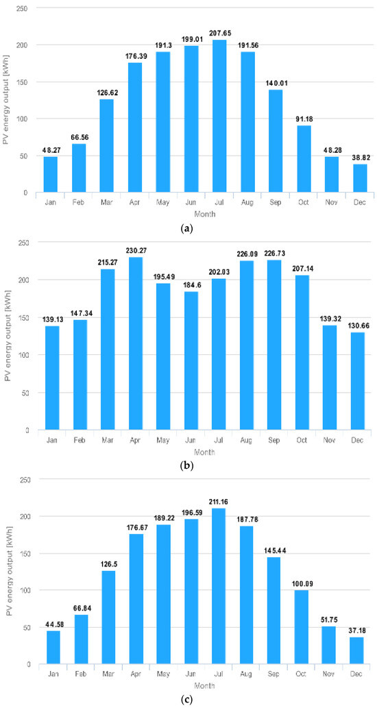 (a) Monthly production for 90° inclination and west-facing slope azimuth. (b) Monthly production for a 90° slope and south-facing fall azimuth. (c) Monthly production for a 90° slope and east-facing fall azimuth.