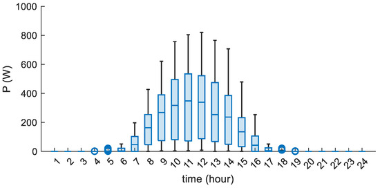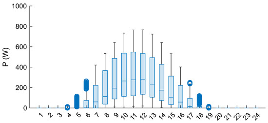 The choice of where to position the PV panels (horizontally on the roof or vertically on a south-facing wall) affects not only the amount and variability of monthly energy production throughout the year, but also the daily energy production profile. In order to compare the two solutions, the results presented are for an equal PV capacity of 1 kWp. The data for the analysis is from the year 2020 and was taken from the PVGIS database. The graphical representation of the statistical features of the daily production profiles is presented in the form of box plots (Figure 7 and Figure 8).