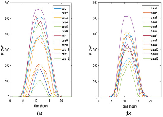 Monthly average daily profiles for both cases are presented in Figure 9. It can be seen that for wall-mounted panels, the hourly range of significant energy production (above 5% of installed capacity) is smaller (7–17) than for roof-mounted panels (5–18). There is clearly less variation in energy production for individual months in the case of wall-mounted versus roof-mounted panels. The minimum average monthly production (December) is more than twice as high for wall-mounted panels as for roof-mounted panels (Table 5), which is a significant advantage for this type of arrangement.