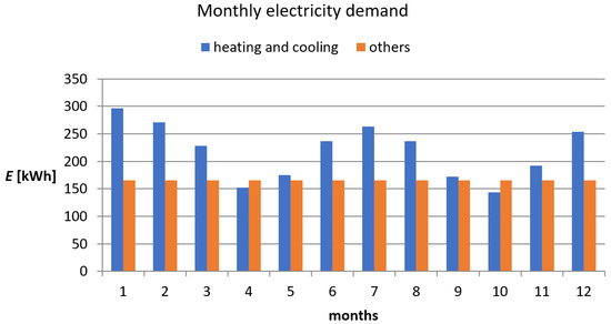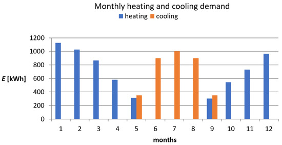 As a source of thermal energy, it is proposed to choose a reversible air-to-air heat pump with a heating capacity calculated at an outdoor temperature of 2 °C of a min. of 4–5 kW (monovalent operation of the heat pump is assumed, that is, without an additional parallel energy source). The demand for thermal energy and cooling for the analyzed object must take into account the monthly average temperatures for Cracow (Table 10). The balance of thermal energy consumption in individual months of the year is presented in Figure 13 and was prepared using the application https://dimplex24.pl/ (accessed on 1 March 2024).