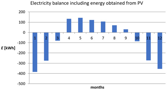 According to the data in Figure 14, the energy consumption of other equipment (Table 10) is 1980 kWh/year. Balancing the facility’s electricity demand with PV energy production (Figure 15), a summary of electricity shortages and surpluses was obtained for each month (Figure 16).