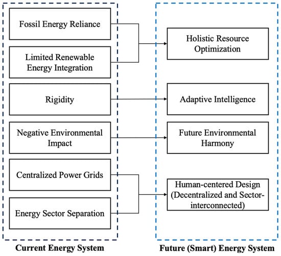 Figure 1 illustrates the comparison between current and future energy systems, showing the transition toward sustainability. Compared to the existing energy system, which heavily depends on conventional energy sources, has limited integration of renewable energy sources, operates on centralized power grids, maintains sector separation, exhibits rigidity, and results in negative environmental impact, the smart energy system presents a noticeable contrast. The smart energy system emphasizes holistic resource optimization, adopts human-centered design principles through decentralization and sector interconnection, employs adaptive intelligence, and aims for future environmental harmony. By integrating various energy applications and optimizing resource utilization, smart energy systems not only address current energy challenges, but also pave the way for a sustainable future.